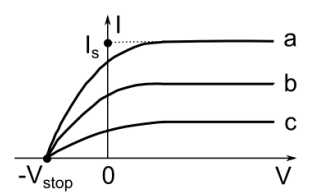 • 当入射光的频率给定后,光电流正比于光强。在入射光强一定时光电流会随电压增大,最后达到一饱和值。饱和电流与入射光强成正比.